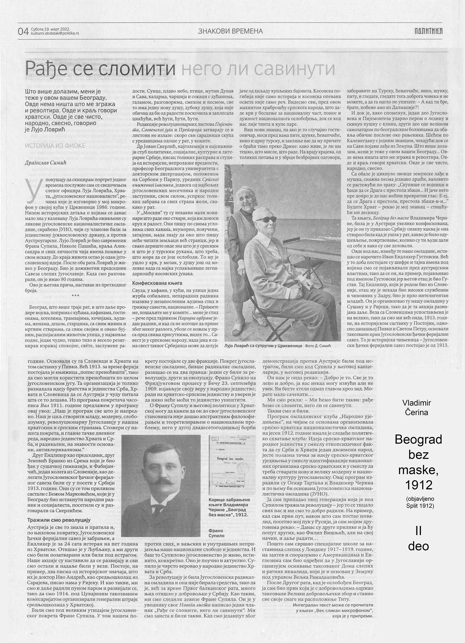 U pokušaju da skiciram portret jednog vremena poslužio sam se svedočenjem slepog oficira Luja Lovrića Hrvata, “jugoslovenskog nacijonaliste” komandira Četvrte čete Trećeg bataljona Drugog puka Prve dobrovoljačke divizije, rečima koje je izgovorio u moj mikrofon u svojoj kući u Crkvenici 1986. godine. Ovu diviziju je osnovala Srpska Vrhovna komanda u Rusiji 1915. godine od vojnika poreklom iz južnoslovenskih zemalja koji su prebegli iz austrougarske vojske. Lovrić je bio teško ranjen u bitki na Dobrudži 1916. Kada smo razgovarali on je imao 90 godina. Knjigu “Beograd bez maske” objavio je u Splitu 1912. Vladimir Čerina, drug Luja Lovrića. Knjigu su vlasti odmah zabranile. Čerina je bio jedan od osnivača JUNO, Jugoslovenske nacionalističke omladine.