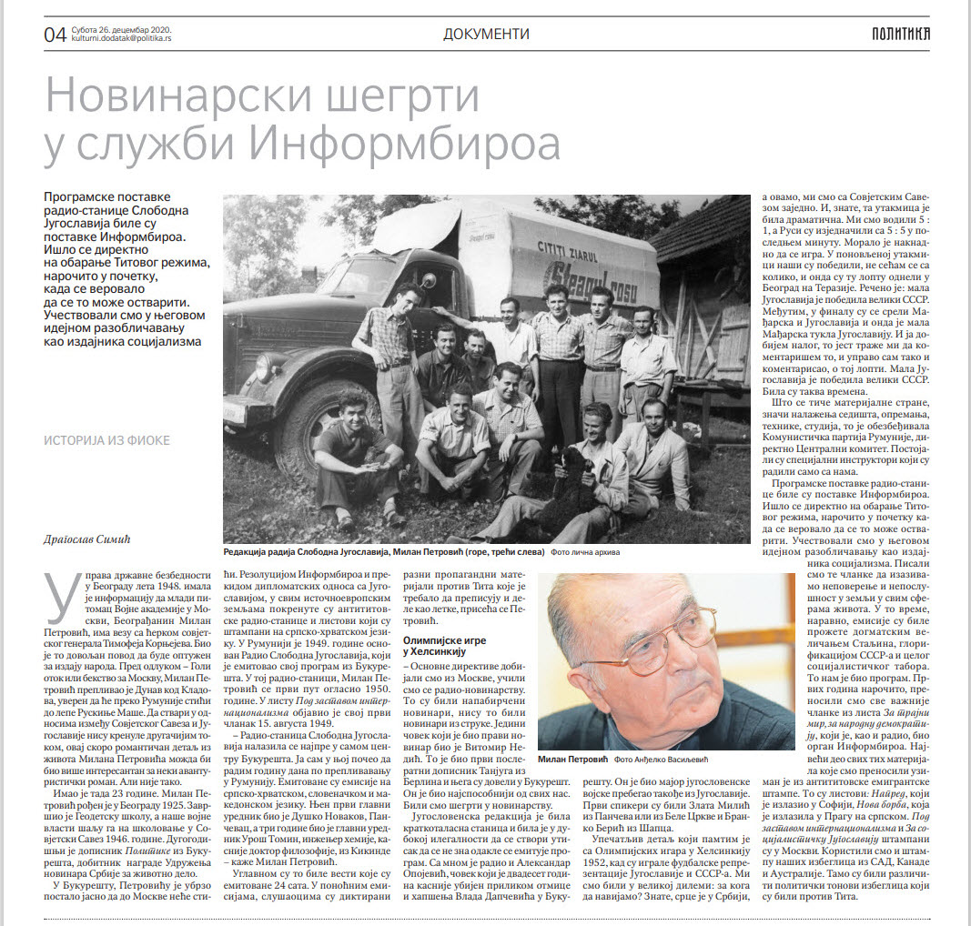 Imao je tada 23 godine. Milan Petrović rođen je u Beogradu 1925. godine. Završio je Geodetsku školu, a naše vojne vlasti šalju ga na školovanje u Sovjetski Savez 1946. godine. Danas je ovaj novinar dopisnik Politike iz Bukurešta.