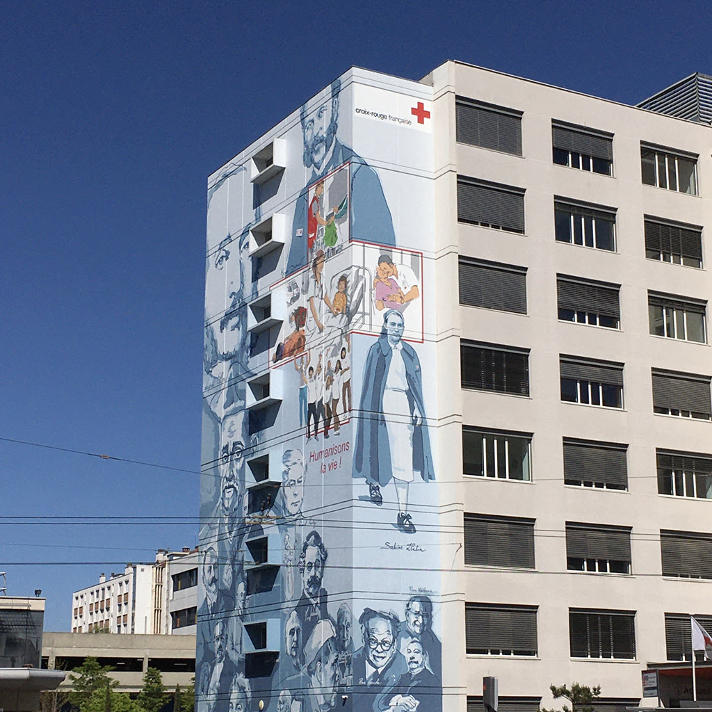 Lion je grad poznat po svojim monumentalnim freskama, kojih ima u svim delovima grada i koje uglavnom za temu imaju lokalnu istoriju. Ova freska nazvana "Humanisons la vie!", naslikana je na fasadi zgrade Crvenog krsta i prikazuje značajne medicinske pregalnike. Među njima je naslikan i Fransoa Rable koji je bio lekar u lionskoj bolnici od 1532 i 1535. godine, upravo u vreme kada je pisao Pantagruela koji je i objavljen u Lionu 1535. godine.