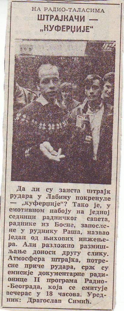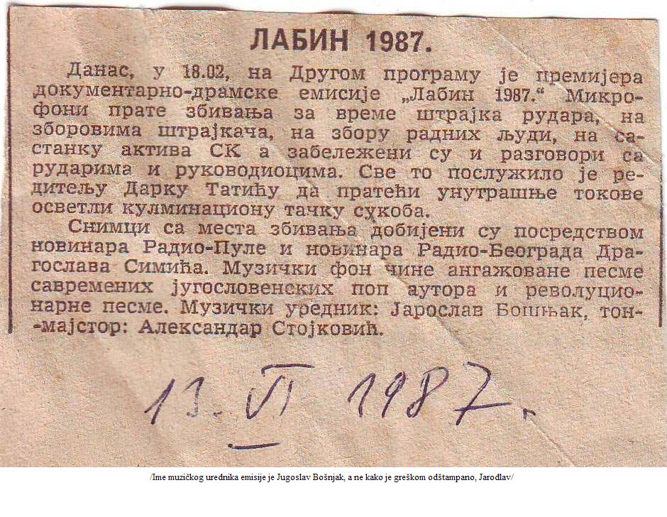 Prvobitni naziv moje dokumentarne emisije glasio je „Štrajkači ~ koferdžije“, a odnosio se na rudare poreklom iz Bosne koji su „trbuhom za kruhom“ stigli u Labinske ugljenokope. „Kuferdžije“ jer je najveći broj njih sa kuferima u rukama u potrazi za boljim poslom često menjao rudnike u kojima su radili po čitavoj nekadašnjoj Jugoslaviji. Seriju fotografija koju gledate snimio sam u Labinu na licu mesta tokom štrajka. Sačuvao sam još jedan isečak najavu emisije iz novina, koja nosi naziv, kako je navedeno „Štrajkači ~ koferdžije“. Ovog februara 2016. godine sve detalje događaja sam zaboravio jednostavno zato što nisam pravio nikakve beleške vezane za moj boravak u Labinu i Puli i snimanje razgovora sa rudarima. Zato je pismo gospodina Marina Badurine koje sam dobio vezano za ovu stranicu, navodim pismo u celini, dragoceno za razumevanje ovih događaja.