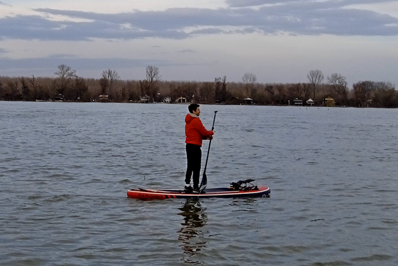 Vozač na dasci upravlja svojim životom. Dunav kod Zemuna, kraj februara 2024.