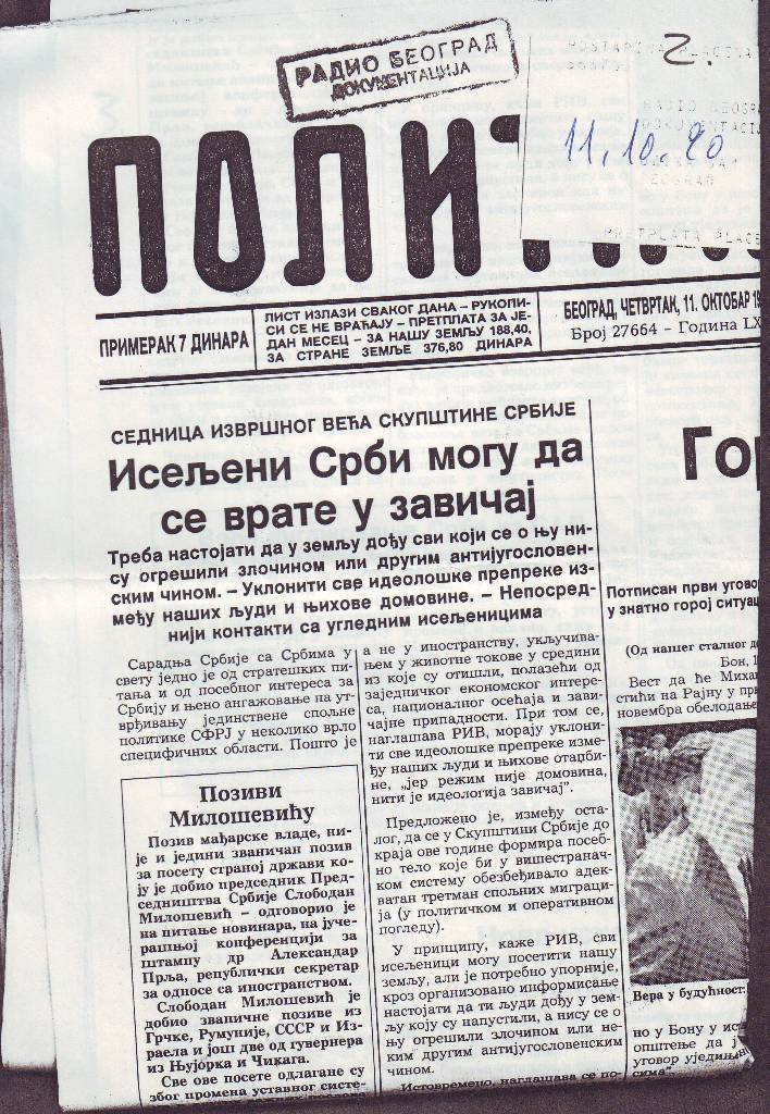 Sačuvao sam ovaj isečak iz novina da bih pokazao kako je Miloševićeva vlada te 1990. godine počela da pokazuje interesovanje za prekomorski svet. Iz naslova se može zaključiti da je pre te godine bio problem vratiti se u zemlju jer je postojala otvorena mogućnost “provere” od strane policije sa pitanjem: gde si bio i šta si radio pre nego što si otišao iz zemlje. Moglo se dogoditi da upitani umesto da uđe u zemlju, ode u zatvor. Ova vrlo nedemokratska pitanja predstavljala su problem koga je htela vlast u čitavoj Jugoslaviji da se reši u pokušaju da sa emigracijom uspostavi dobre odnose. Video sam da je sada ovo “moj trenutak” da i ja pokušam da svoje nepripadanje jedinoj mogućoj partiji do tada u zemlji, komunističkoj, pretvorim u pokušaj da se sa druge strane nađu izvori koji bi platili moj profesionalni boravak u Americi. Uspeo sam u tome, a rezultat je i ova emisija i druge koje sam tokom boravka u Americi i Australiji kasnije ostvario.