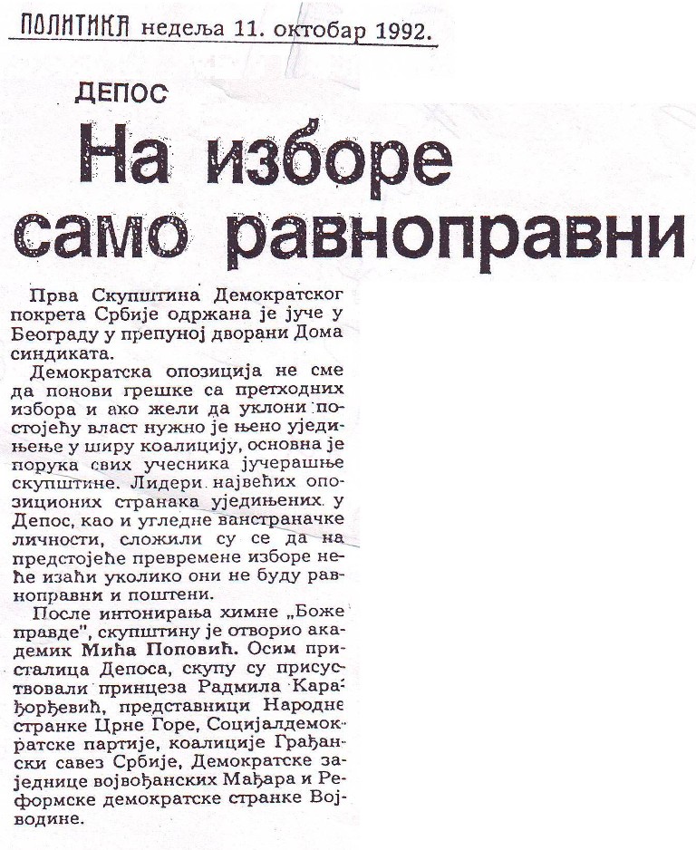 U ovom delu emituju se himna “Bože pravde”, zatim Stanić čita imena članova DEPOSa, a onda govori slikar Mića Popović