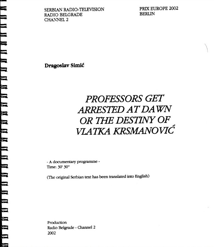 Na festivalu evropskog radija u Berlinu 2002. Radio Beograd, Drugi program, zastupala je dokumentarna emisija Vidi „Profesorka Vlatka Krsmanović iz Sarajeva“. Autor Dragoslav Simić.